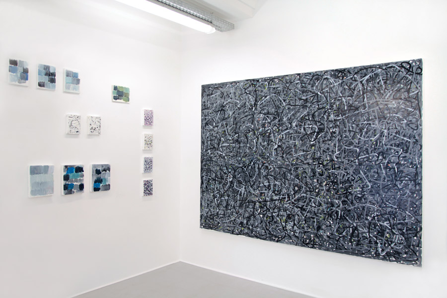 In der Ausstellung werden u.a. Arbeiten aus den Serien „the beastly theory of images and signs“, „the beastly theory of the remains of signs“ sowie „Wittgenstein meets Beckett“ zu sehen sein. Dort setzt sich Dirk Hupe mit den in unserer Gesellschaft allgegenwärtigen Themen „Medien“ und „Kommunikation“ auseinander und baut diese in Form von Zitaten, Fragmenten in gewohnt abstrakter Manier in seine Werke mit ein. Wie der Titel schon sagt beschäftigt er sich mit der Theorie der Schrift/Typografie, Bilder und Zeichen. Bei der Entstehung der wirren Geflechte aus Linien, Punkten und Übermalungen, die Hupe liebevoll „Vernetzungen“, „Endlosschleifen“, „Textmarkierungen“ oder „Zitatfragmente“ nennt, orientiert er sich u.a. an Zitaten Wittgensteins und Becketts, Kinderzeichnungen, Filmen, Gemälden anderer Künstler oder bedient sich an persönlichen Fotografien sowie Eindrücken aus dem Alltag. Die meist auf Leinwand befindlichen Arbeiten bestechen durch ihre Schichtung aus verschiedensten Materialien und Techniken. Die verschachtelten, überlagernden Ebenen aus typographischen, abstrakten Strukturen sind teils mit einer weiteren Schicht, bestehend aus Montagefolie, bedeckt, aber nicht verdeckt. Die Folie ist durchsichtig, wie auch die unterschiedlichen Strukturen der Bilder, welche verschiedene Ebenen und Farbschichten durchscheinen lassen. Diese lässt den Betrachter wie durch eine Scheibe oder ein Fenster in das Werk hineinschauen, ähnlich wie bei Fernsehern, Computern oder Smartphones, die in der heutigen Zeit wesentlich zur Kommunikation durch Medien beitragen. Die schriftlichen Elemente erzeugen virtuose Kompositionen die zu intensiver Betrachtung einladen. Die diversen Hintergründe der einzelnen Werke ohne weitere Informationen zu ergründen oder jegliche eingearbeitete Wortfetzen zu entziffern ist dabei nahezu unmöglich, da die Gesamtwirkung jedoch immer eine abstrakte bleibt. Ganz besonders interessant sind Hupes Buchobjekte, die, wie der Ausstellungstitel „ver-buchungen“ bereits erahnen lässt, eine zentrale Rolle in dieser Präsentation innehaben. Da sich der Künstler zur Inspiration oftmals literarischer Schriften und wissenschaftlicher Werke bedient, steht das Buch exemplarisch für seine künstlerische Auseinandersetzung mit Text und Schrift.